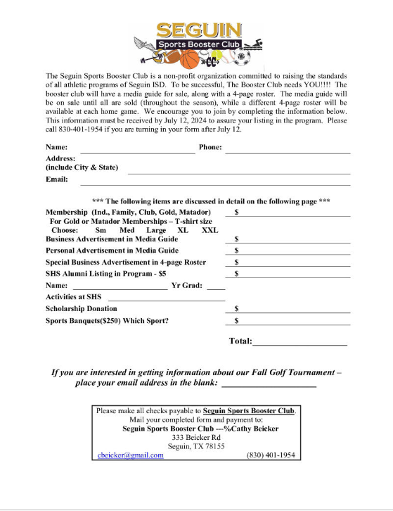 Seguin Sports Booster Club - Due July 12th